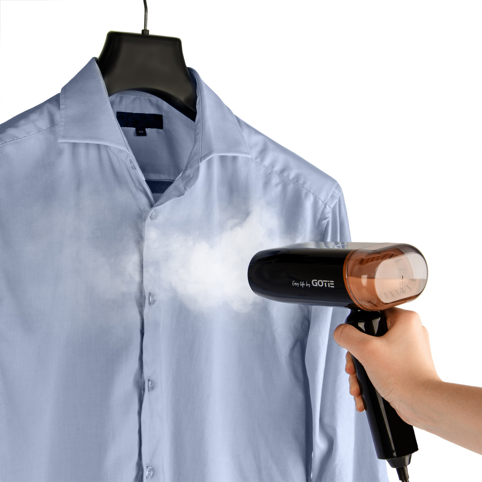 Generator pary GOTIE zapewnia prasowanie przy użyciu wysokociśnieniowej pary o wartości aż 6 bar. Podczas pracy generuje do 130 g pary na minutę, co umożliwia skuteczne usuwanie zagnieceń z różnych rodzajów tkanin. W przypadku trudnych zagnieceń można skorzystać z funkcji silnego uderzenia pary o mocy nawet 400 g/min., aby szybko i skutecznie pozbyć się problemów z gnieceniem tkanin.